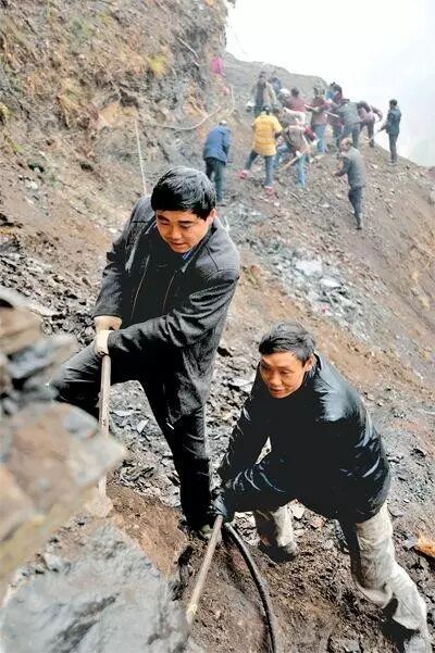 △王光国(左一)和店子坪村民们一起凿山修路。